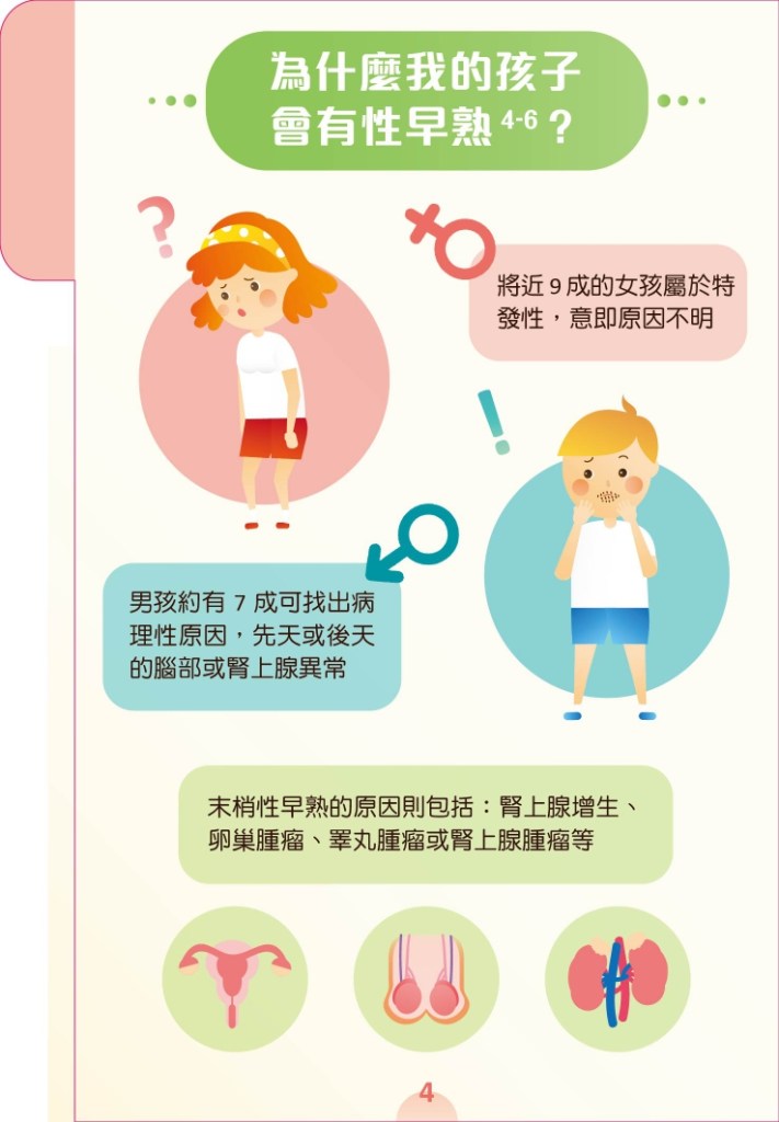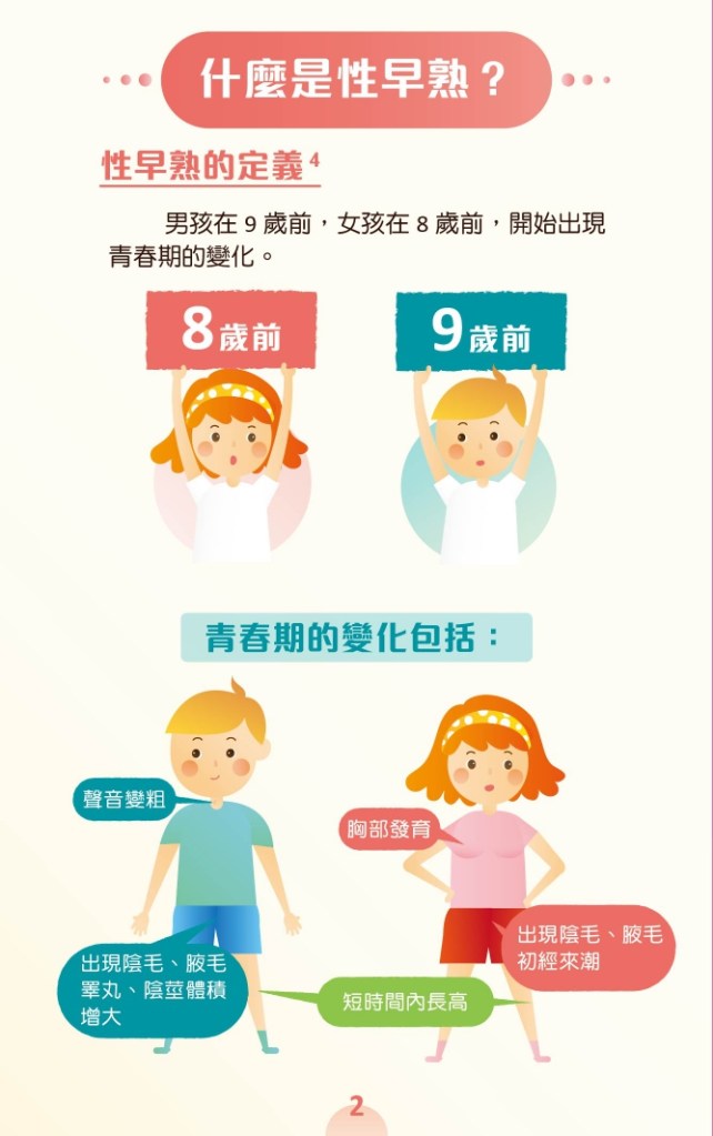 男生在9歲前,女生在8歲前有第二性徵發育,第二性徵像是乳房發育,長陰毛或腋毛,聲音變粗,睪丸和陰莖變大等
